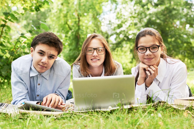 Группа детей, учащихся на зеленой лужайке