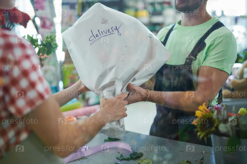 Доставщик, дающий букет