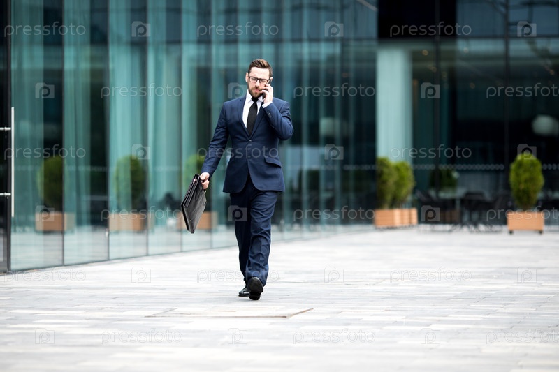 Бизнесмен идет рядом с офисным зданием