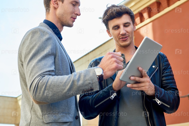 Два современных бизнесмена используют цифровые планшеты на открытом воздухе