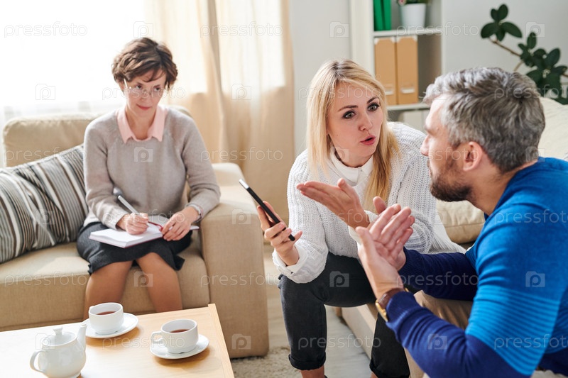 Печальная жена ссорится со своим неверным мужем на сессии терапии