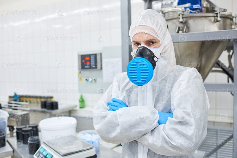 Работник фабрики, стоящий в защитной одежде