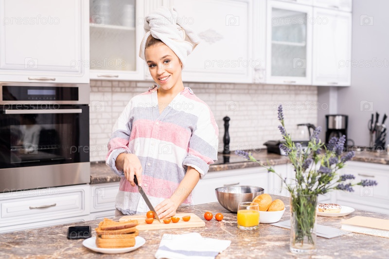 Счастливая домохозяйка, готовящая на кухне