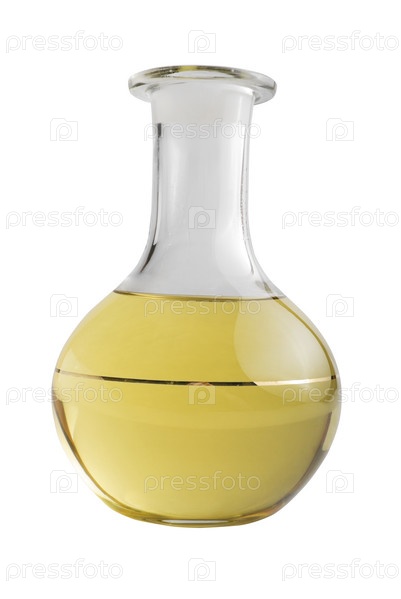 Стеклянный графин с желтой жидкостью, изолированный на белом фоне