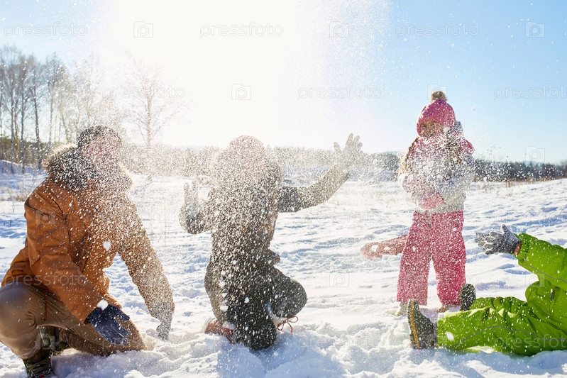 Семья играет со снегом