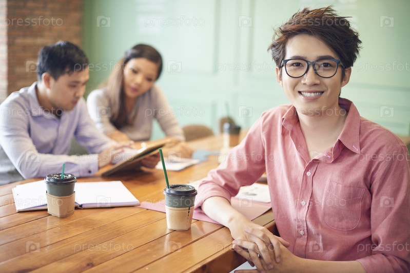 Молодой азиатский мужчина с коллегами по работе в перерыве на кофе