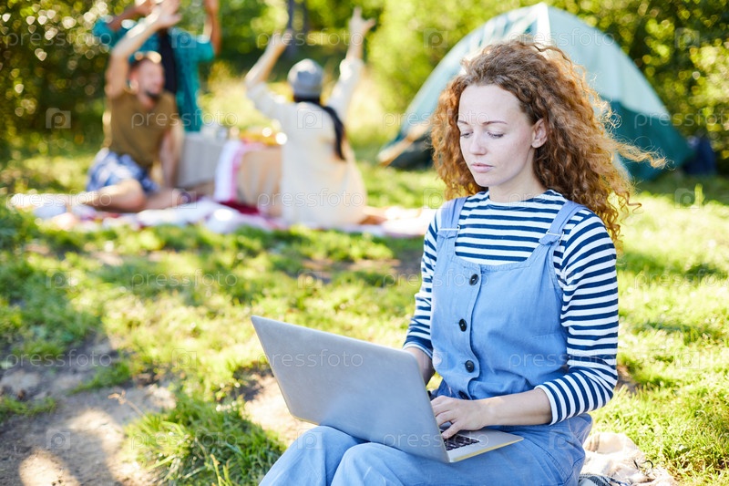 Молодая бизнесвумен звонит клиентам и общается в сети во время путешествия с друзьями