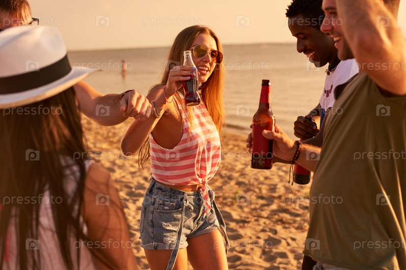 Беспечные друзья пьют пиво на пляжной вечеринке