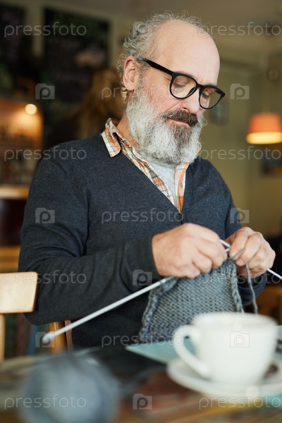 Мужчина вяжет в кафе