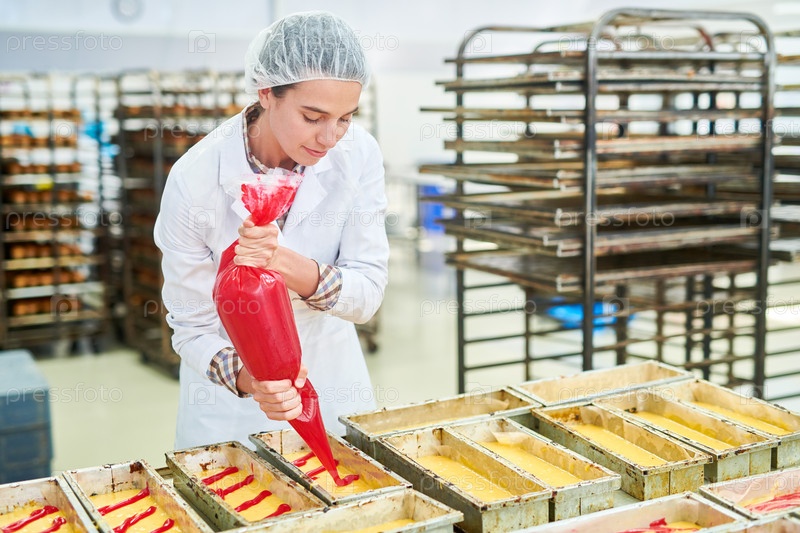 Работник фабрики кондитерских изделий использует пакет для выпечки