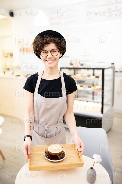 Счастливая женщина в фартуке, работающая в кафе