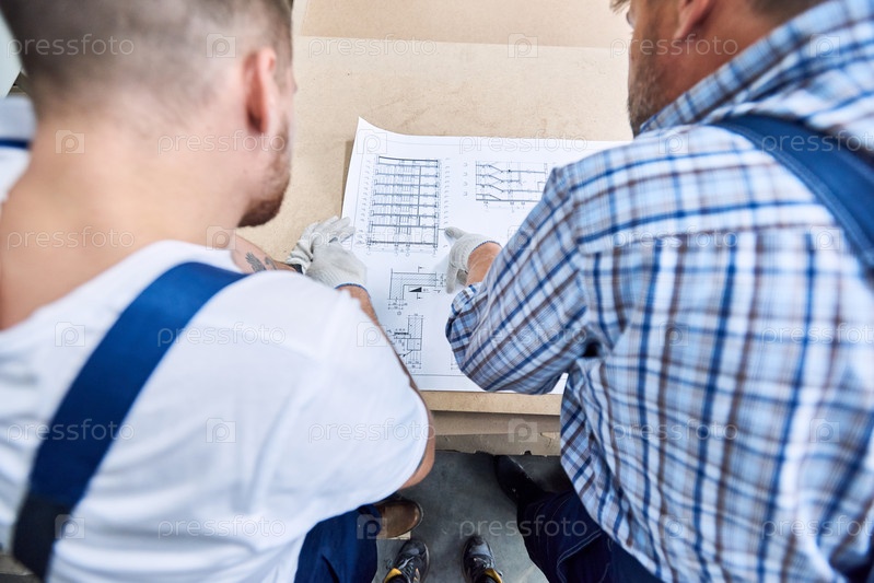 Два рабочего смотрят на схемы