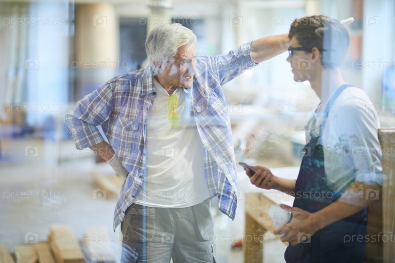 Разгневанный плотничий бригадир кричит на ленивого рабочего