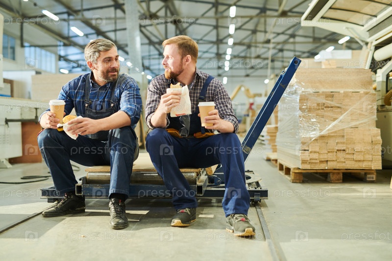 Содержание коллег в рабочей одежде, пьющих кофе на фабрике