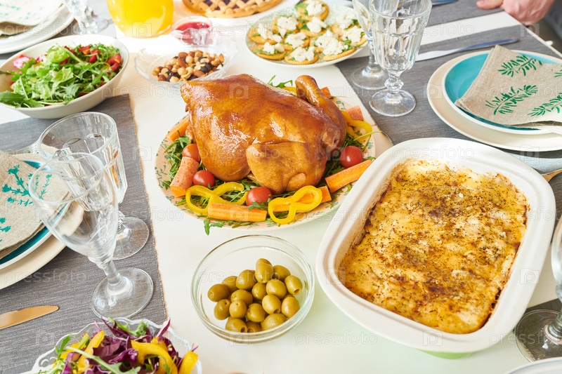 Вкусная золотая курица на обеденном столе