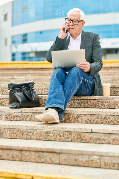 Старший бизнесмен с ноутбуком разговаривает со смартфоном
