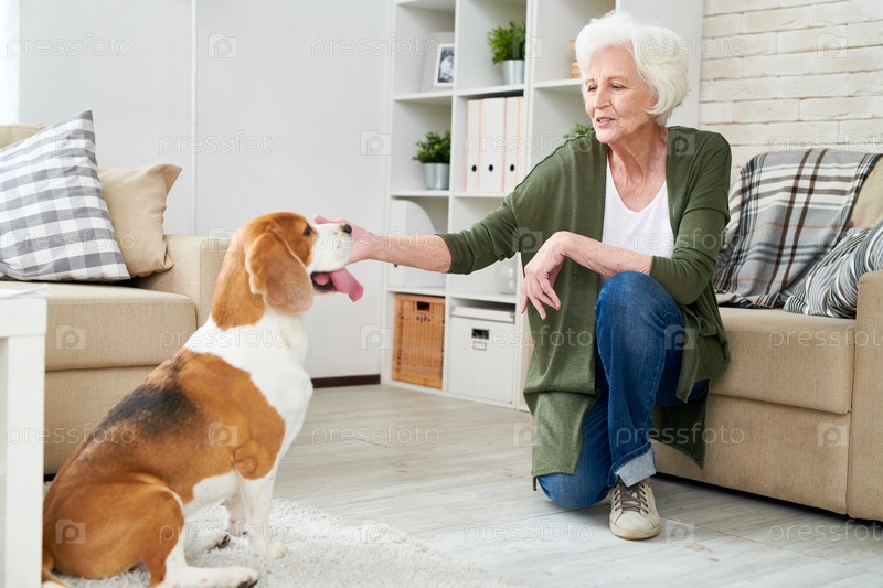 Улыбающаяся старшая женщина играет с собакой