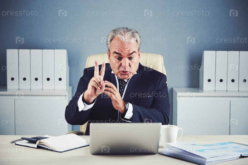 Разгневанный зрелый бизнесмен разговаривает на видеочате