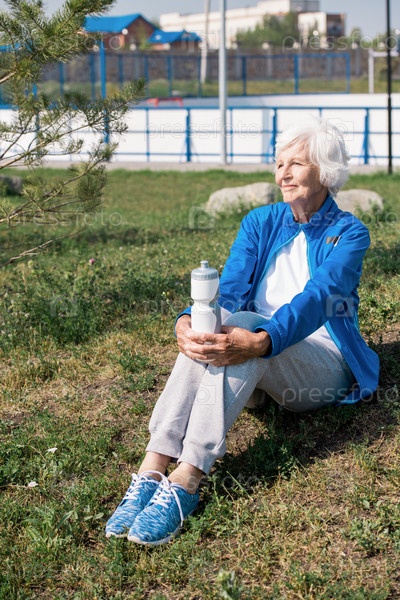 Современная старшая женщина, отдыхающая на газоне