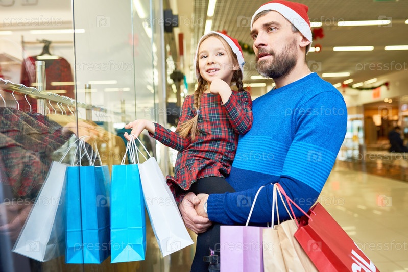 Девочка с отцом делают покупки перед рождественскими праздниками