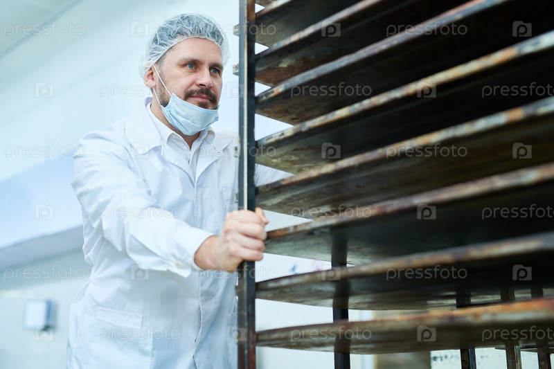 Мужчина в белой форме перемещает полки для хлеба
