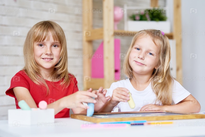 Милые сестры играют с чернильной доской