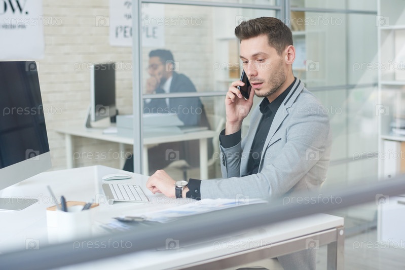 Молодой бизнесмен разговаривает по телефону на работе