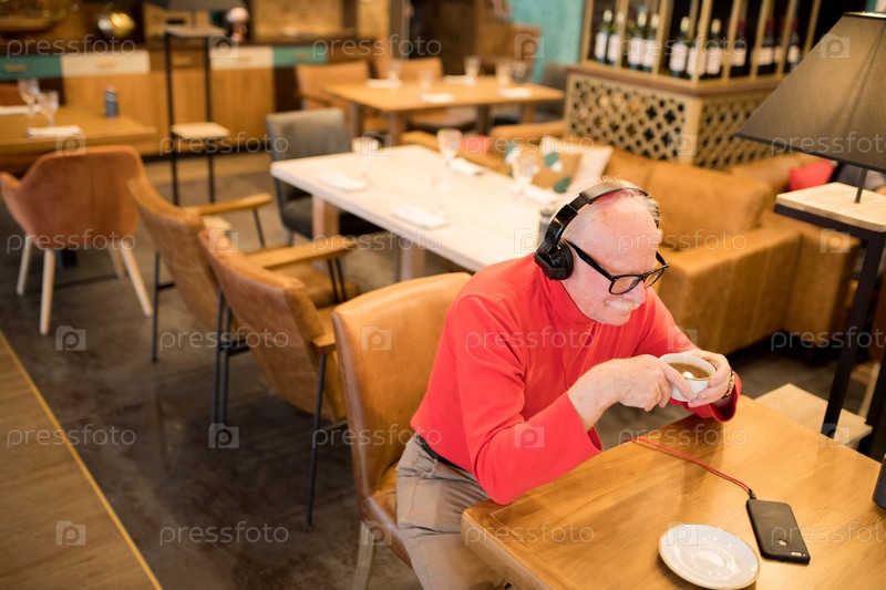 Позитивный старший мужчина, слушающий музыку в наушниках