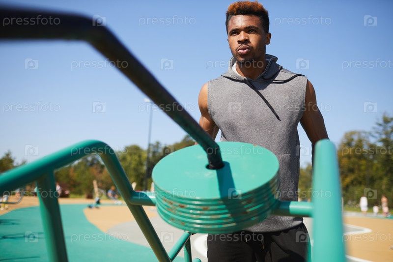 Чернокожий мужчина, выдыхающий во время тренировки с тренажерным оборудованием