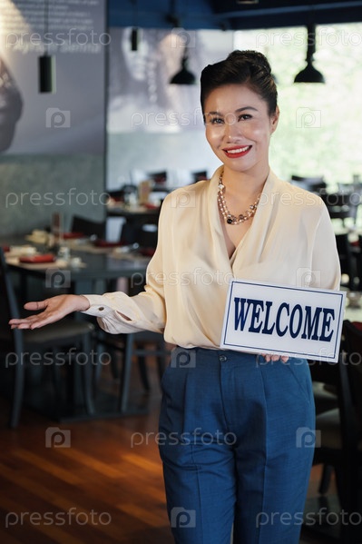 Улыбающаяся азиатская официантка показывает знак Добро пожаловать