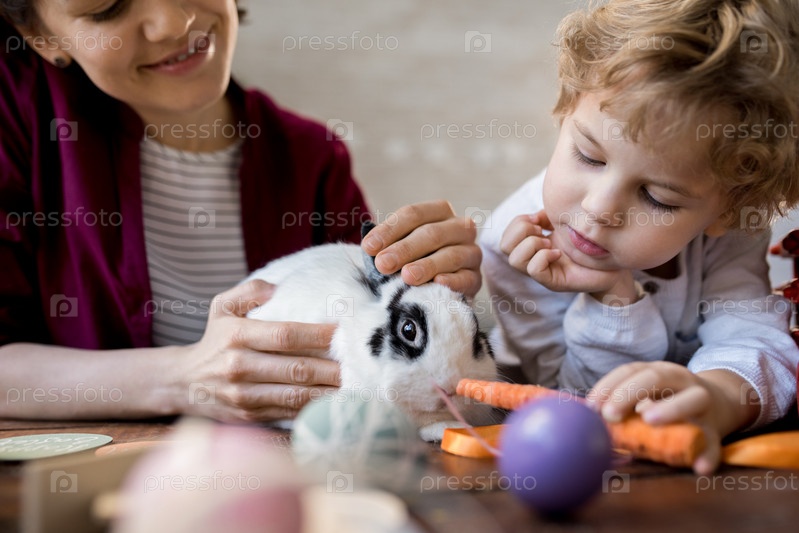 Маленький мальчик кормит домашнего кролика