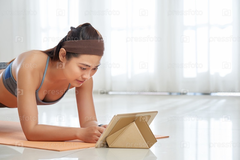 Женщина смотрит на планшет в позе доски