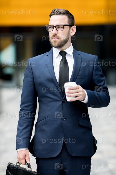 Мужчина с пластиковой чашей возле офисного здания