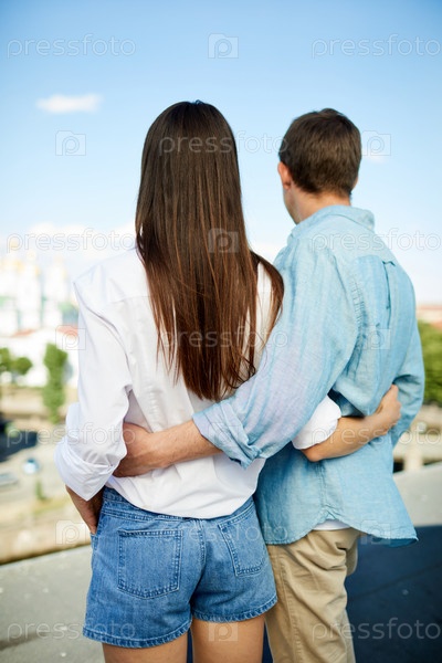 Пара обнимает друг друга и смотрит на расстояние