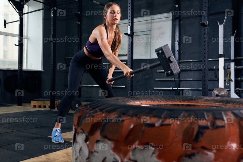 Женщина в тренировке CrossFit с помощью молотка