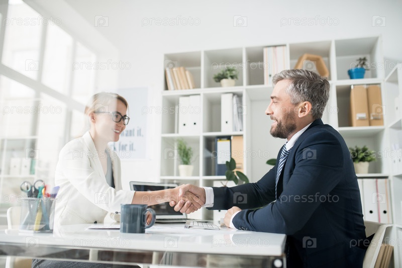 Счастливые бизнес-партнеры, дающие рукопожатие как символ кооперации