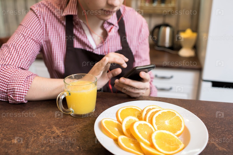 Человек в наушниках, использующий смартфон на кухне
