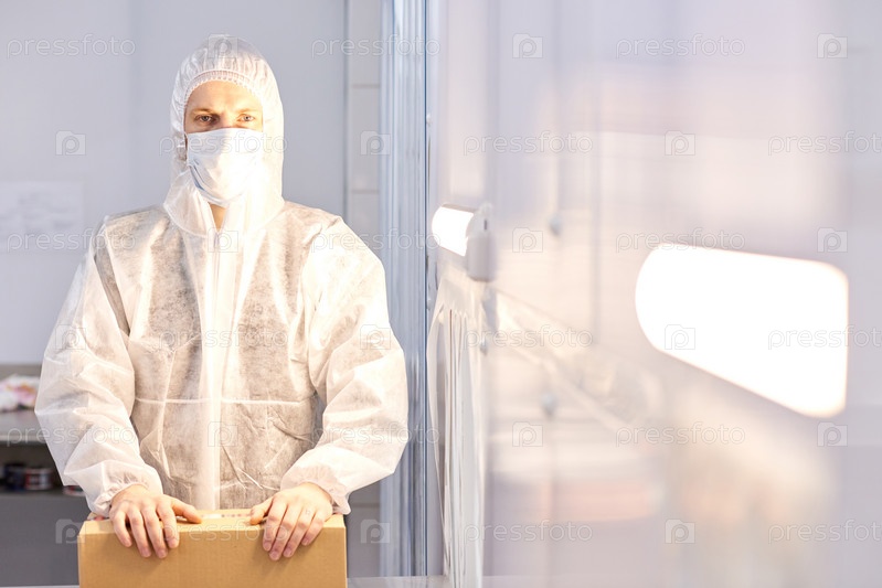 Фабричный работник с коробкой, стоящий в защитной одежде