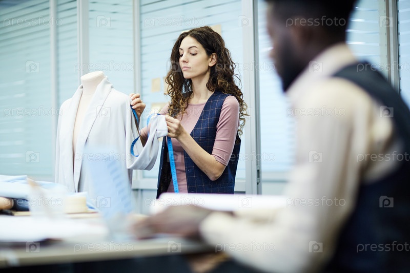 Серьезная леди-помощница измеряет рукав куртки
