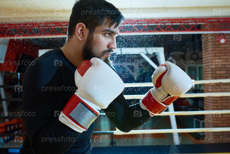 Уверенный бородатый боксер на стенде