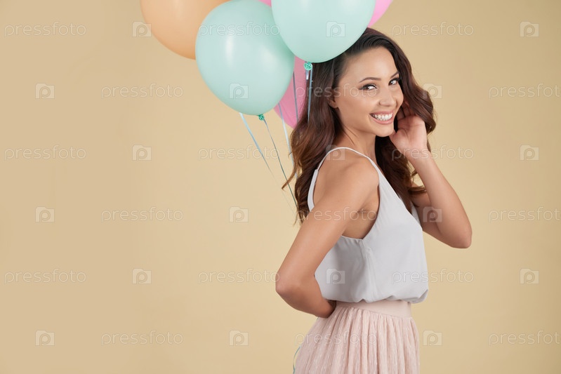Смешная девушка прячет гелиевые шарики за спиной