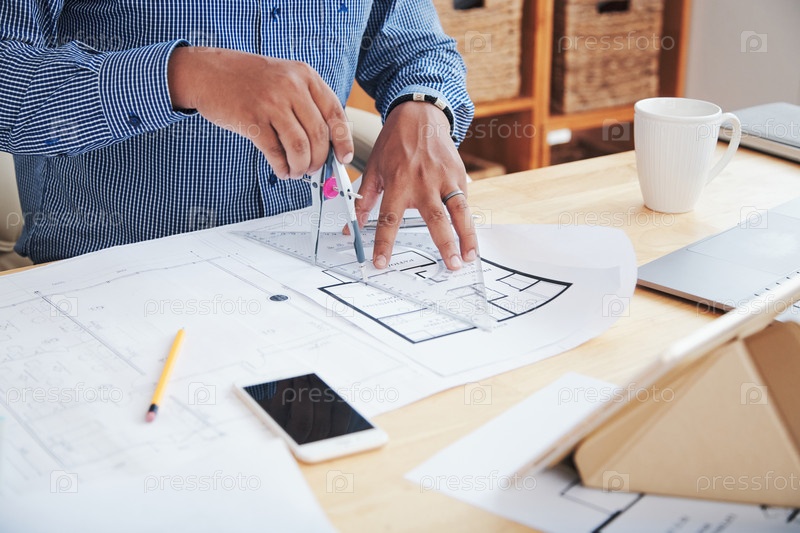 Архитектор использует компасы на чертеже