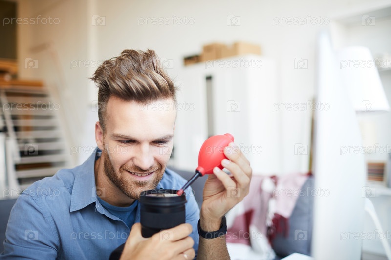 Фотограф очищает объектив камеры