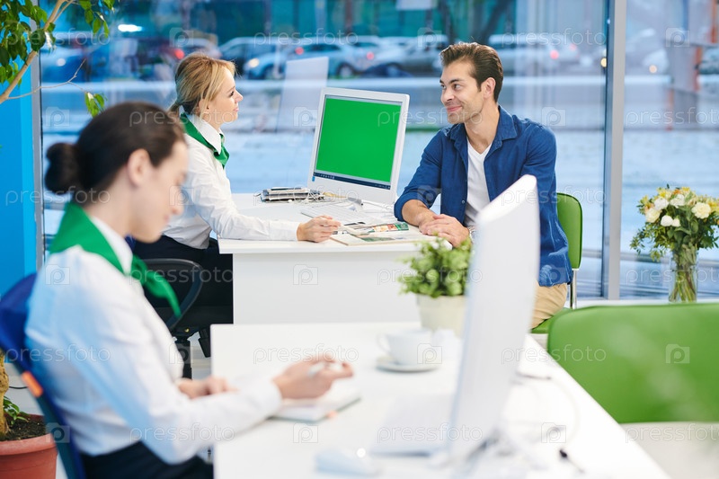 Дружелюбный консультант разговаривает с привлекательным клиентом