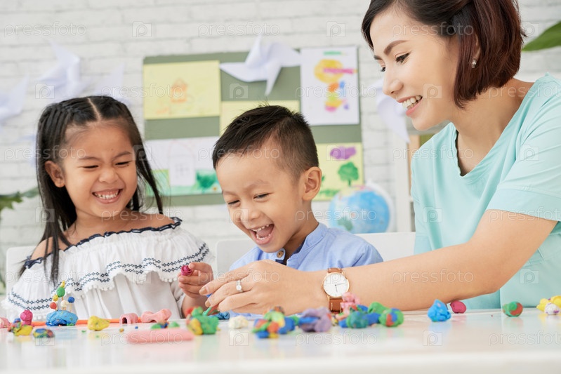 Счастливые дети и учитель играют в пластилин