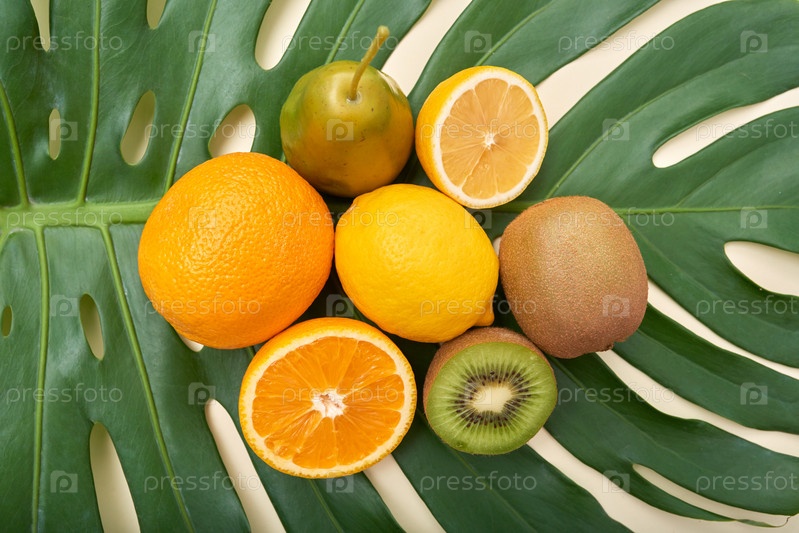 Куча ярких фруктов на вершине зеленого листа