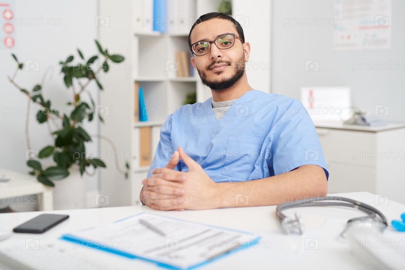 Уверенный врач с Ближнего Востока позирует за столом