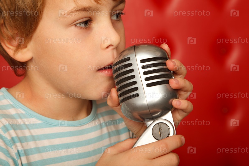 Маленький мальчик с микрофоном на фоне красной стены