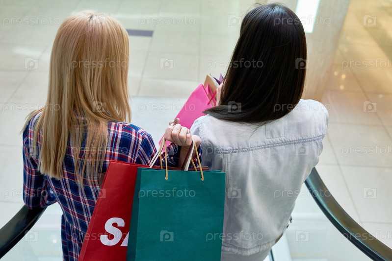 Девушки, спускающиеся по эскалаторам в торговом центре