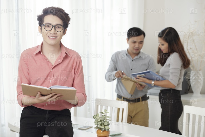 Молодой азиатский работник с книгой и коллегами